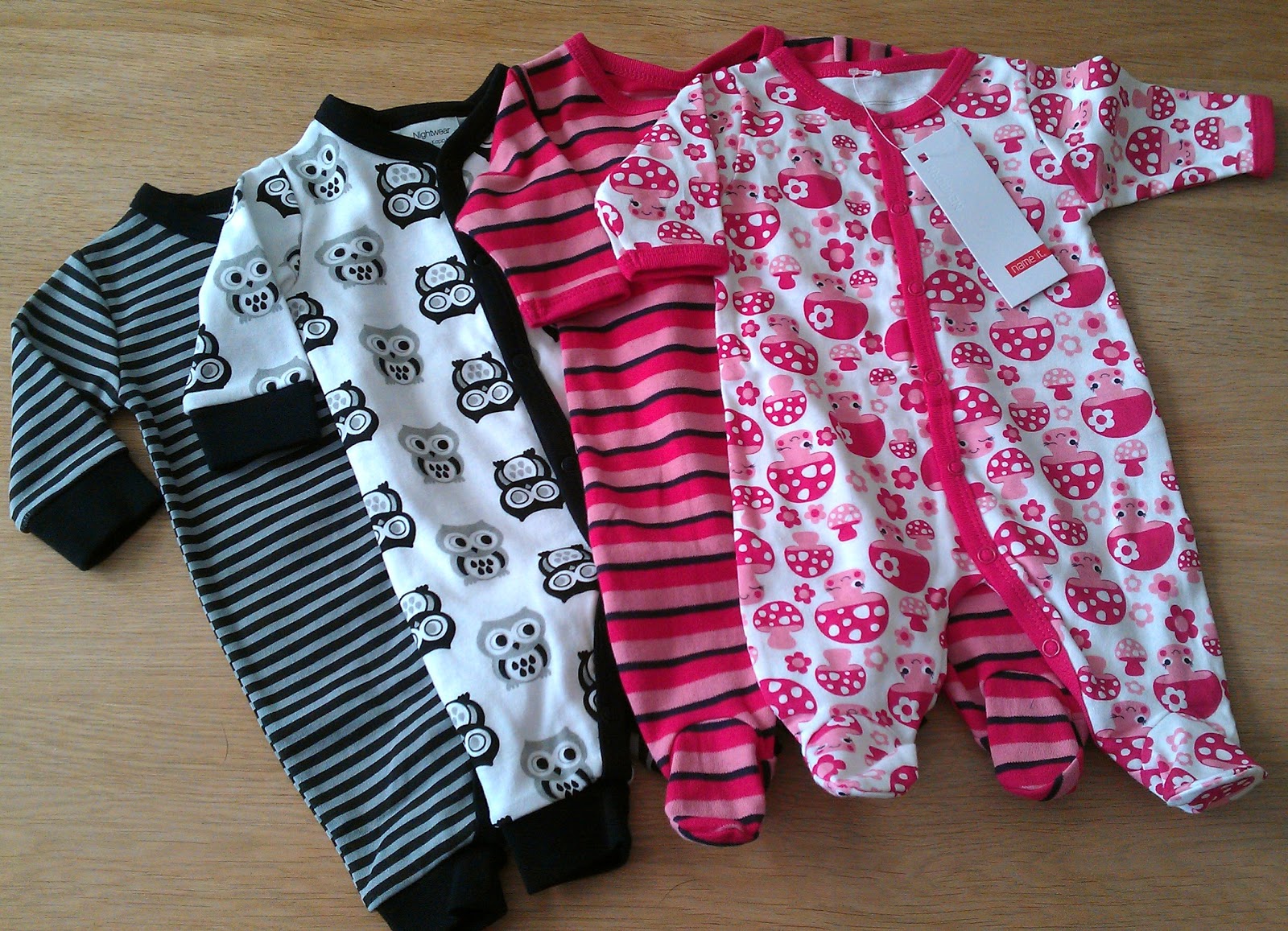 Jeg liker den med ugler og den med sopp best! Det er bra Einar kommer og bryter litt med alle de søte, blekrosa plaggene jeg har kjøpt til henne :) Einar fant dessuten en body han bare